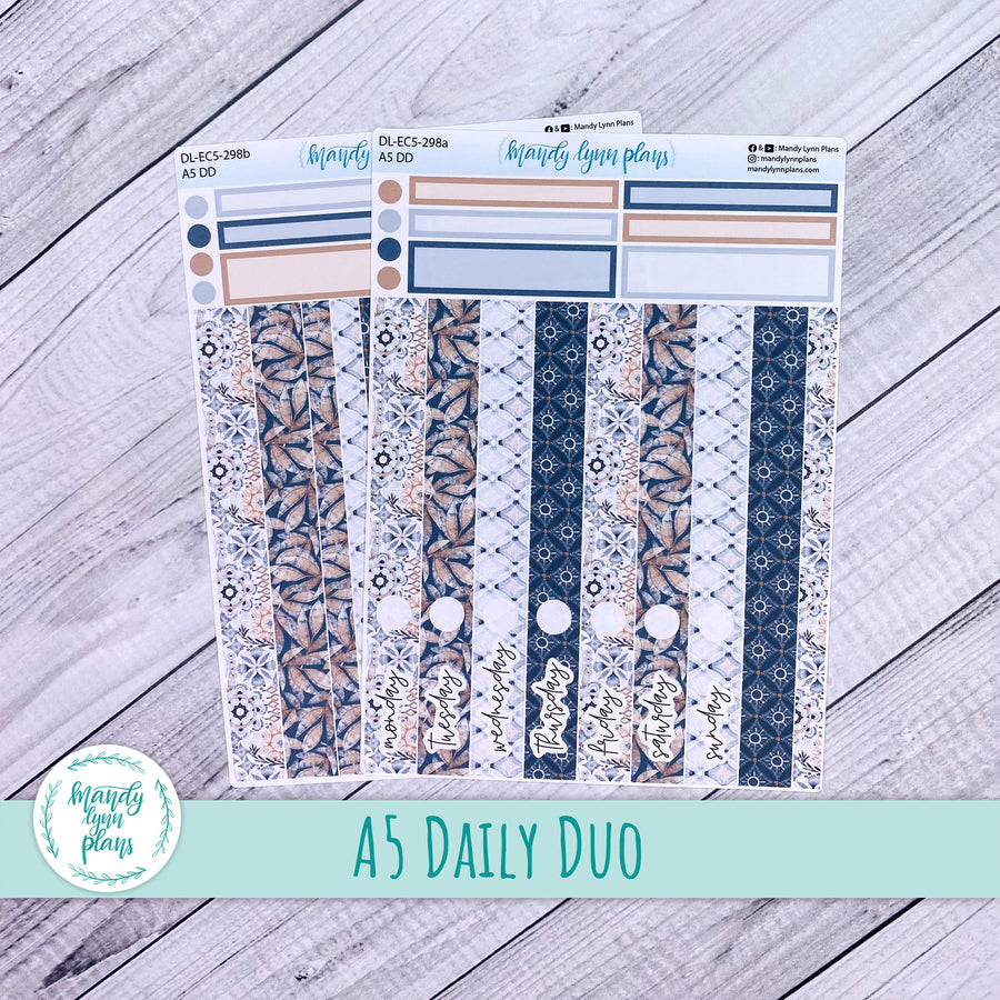 This kit includes 2 pages of stickers: 10 large washi strips and 10 skinny strips for the bottom of the page. It is designed for the A5 EC Daily Duo planner.