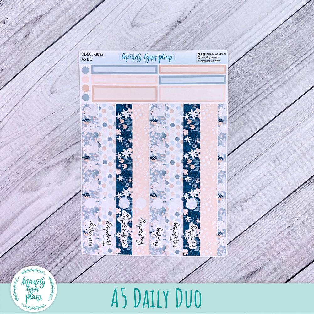 This kit includes 2 pages of stickers: 10 large washi strips and 10 skinny strips for the bottom of the page. It is designed for the A5 EC Daily Duo planner.