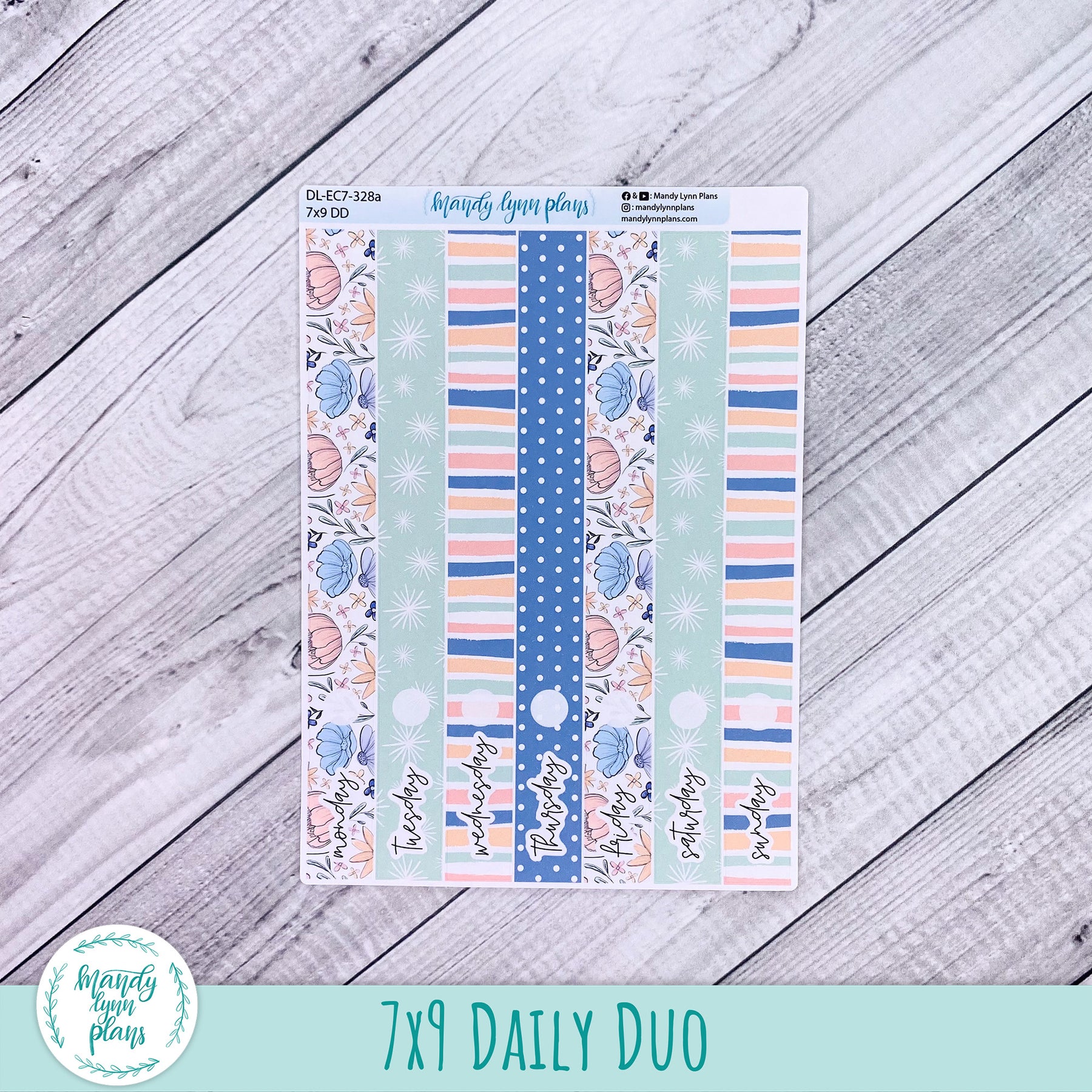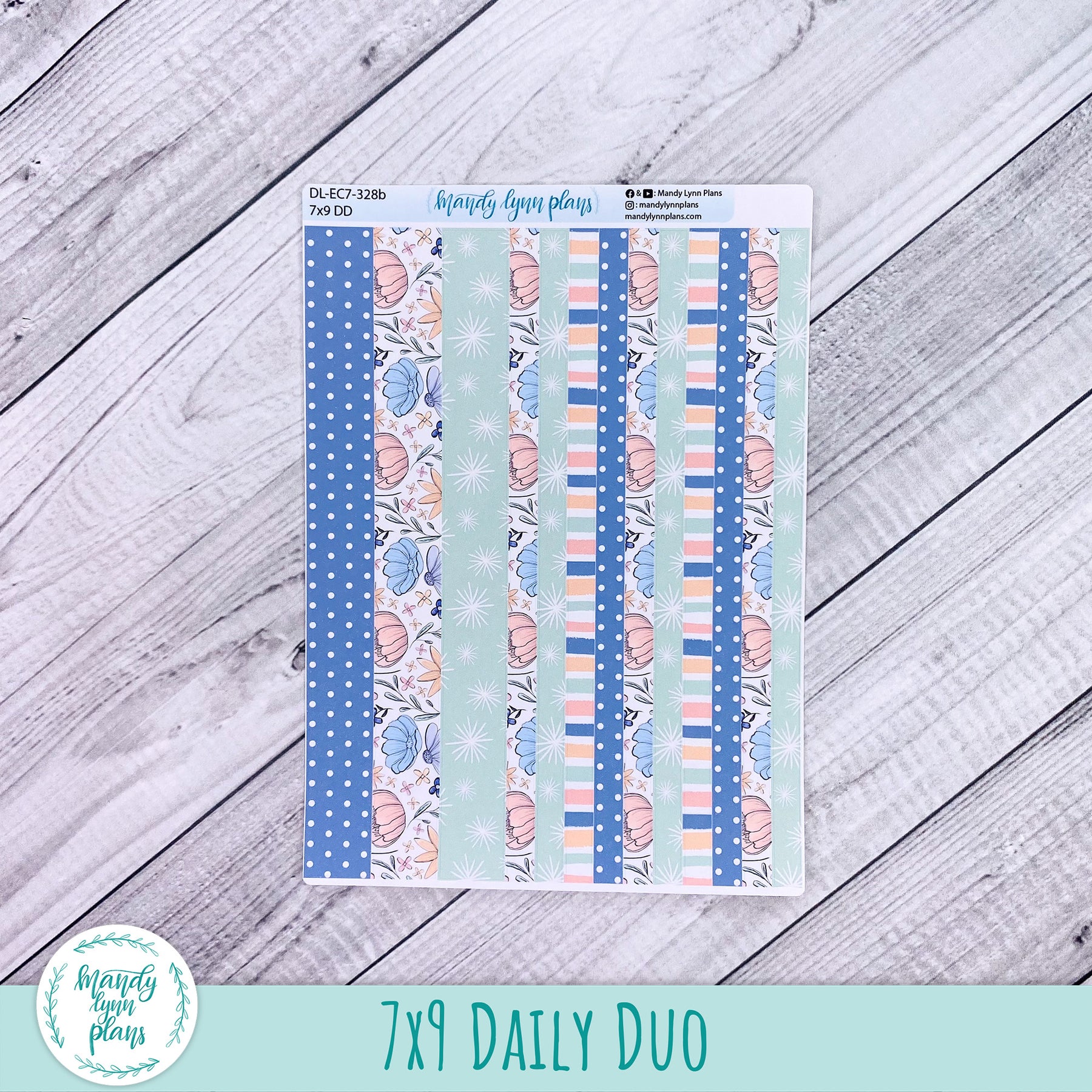 This kit includes 2 pages of stickers: 10 large washi strips and 10 skinny strips for the bottom of the page. It is designed for the 7x9 EC Daily Duo planner.