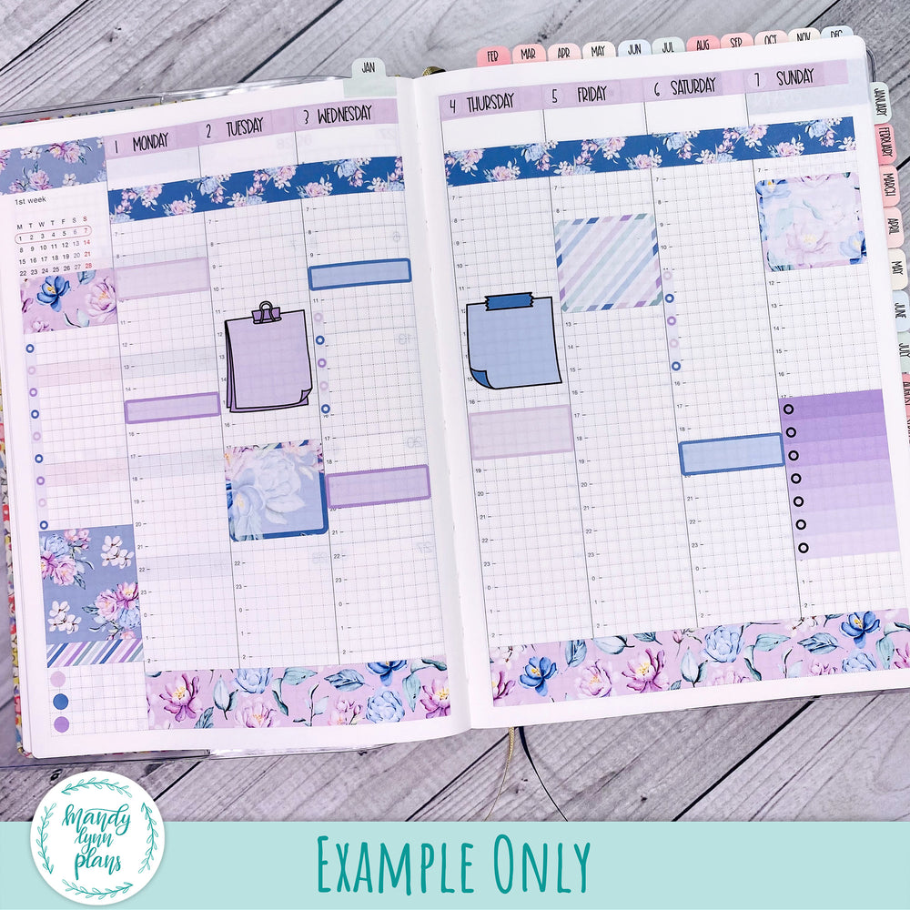 This kit includes 2 pages of stickers: 7 date covers and 7 large washi strips for the bottom of the page. Sheets also include dots and checklists.  This kit is designed for the Hobonichi Cousin, but can be used in the Wonderland 222, Common Planner, or other A5 daily planner.