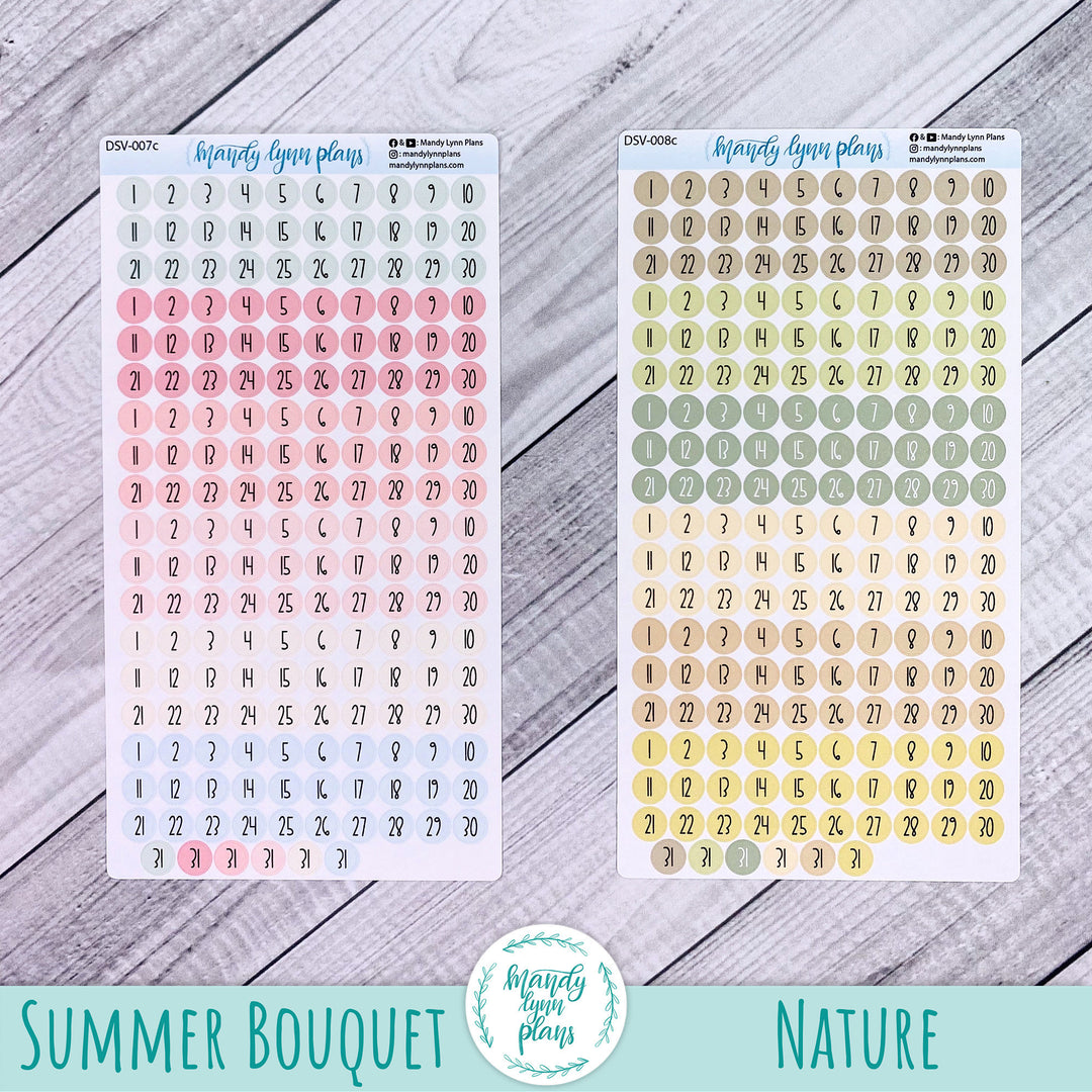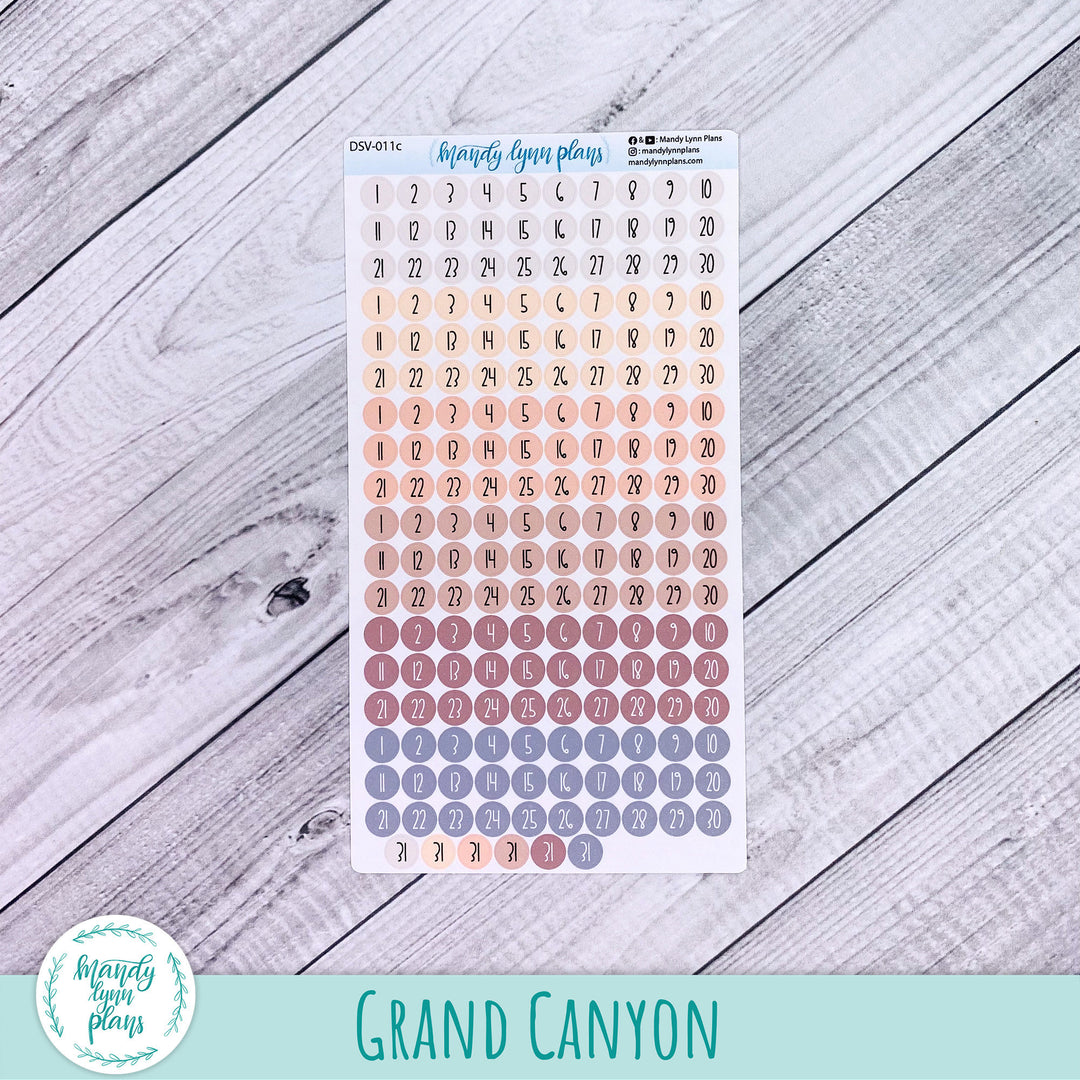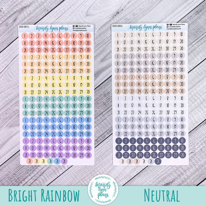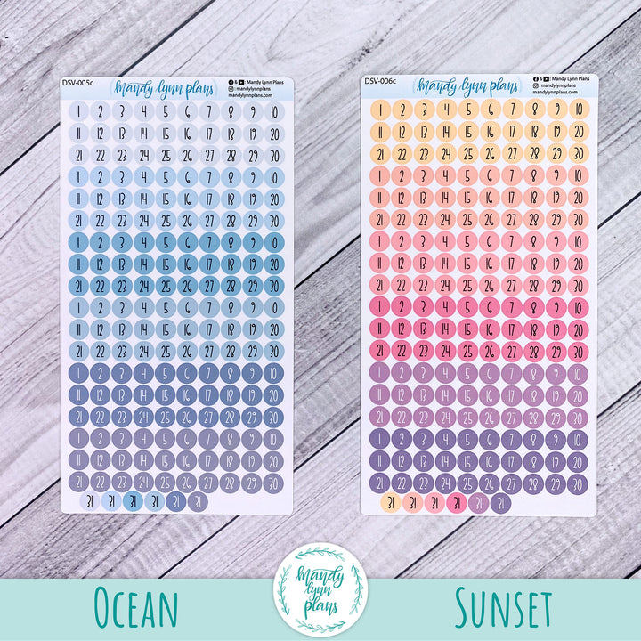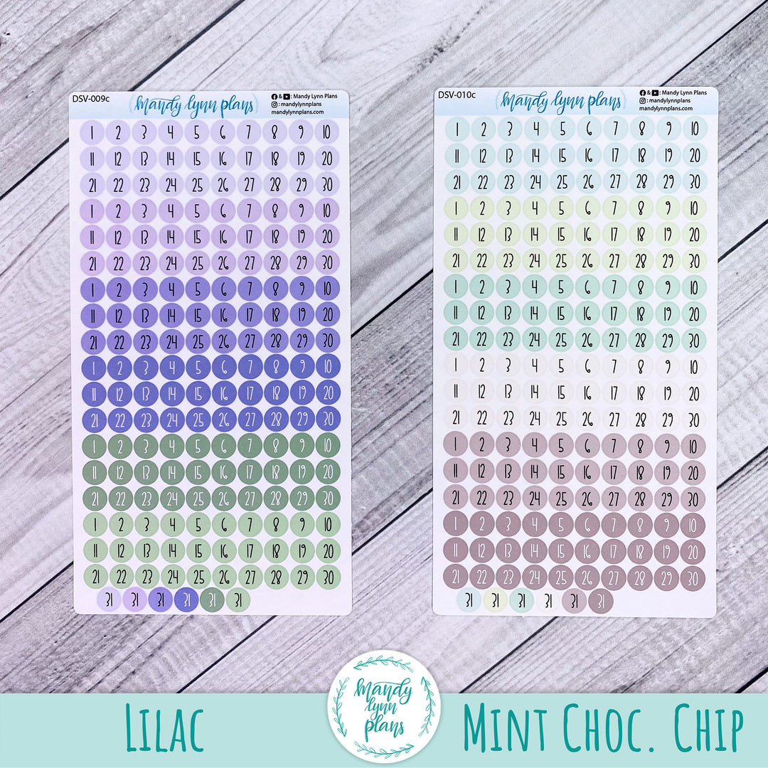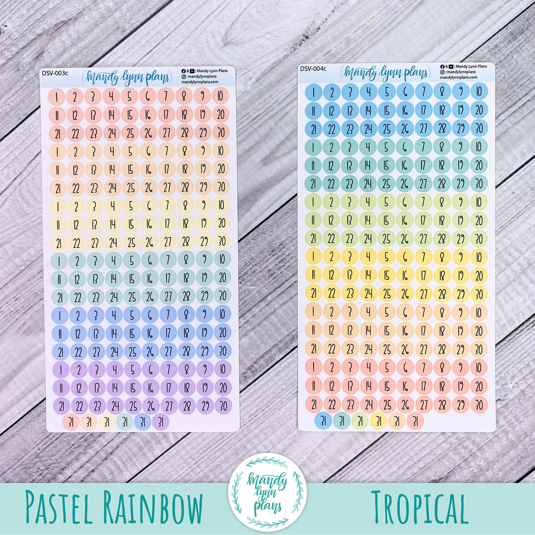 This listing is for one sheet of colored medium sized date dots. They are a great size for many planners, see example photos for an idea on sizing.