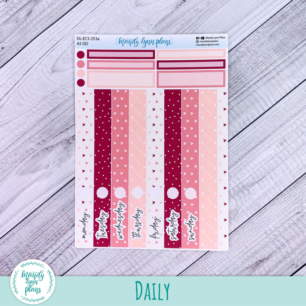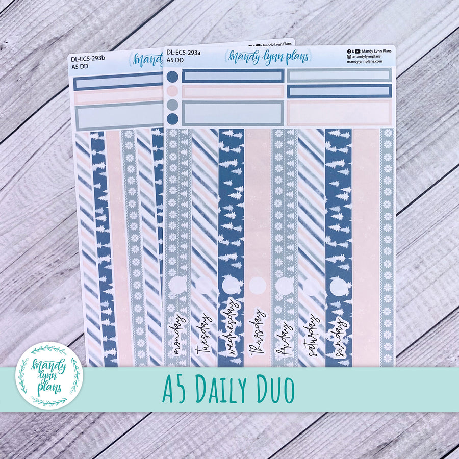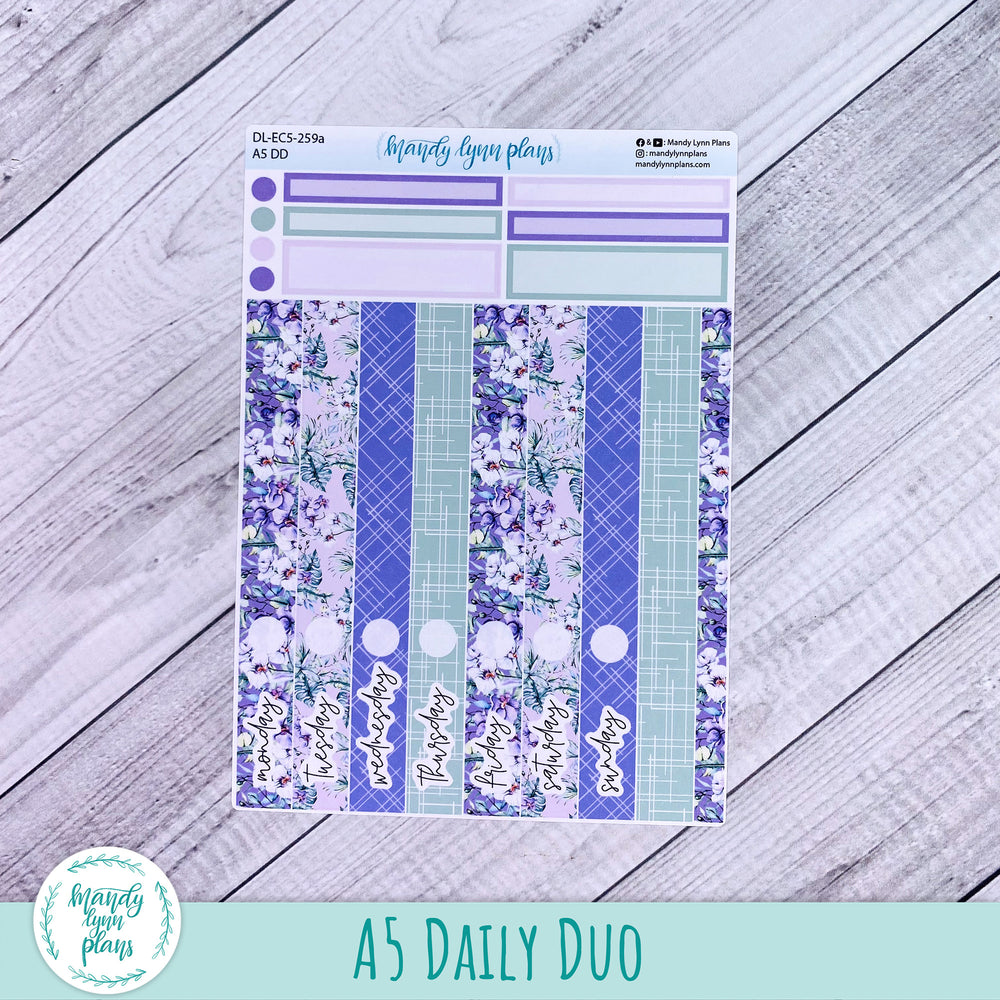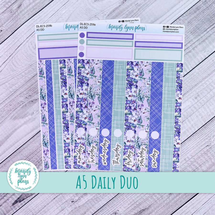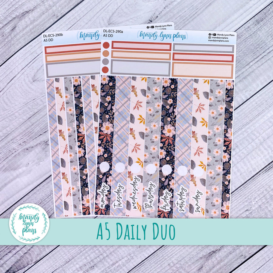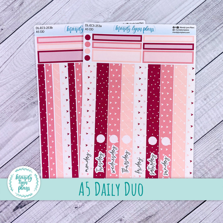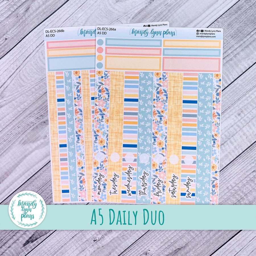This kit includes 2 pages of stickers: 8 large washi strips and 8 skinny strips for the bottom of the page. It is designed for the A5 EC Daily Duo planner.