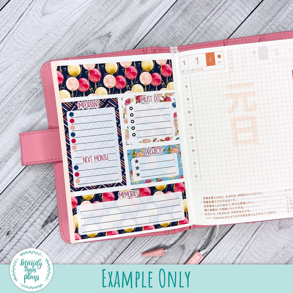 Each kit includes a top washi strip with the hand-lettered month and 4 boxes with lines for writing. 27 script options for headers, and coordinating planner dots are also included.
