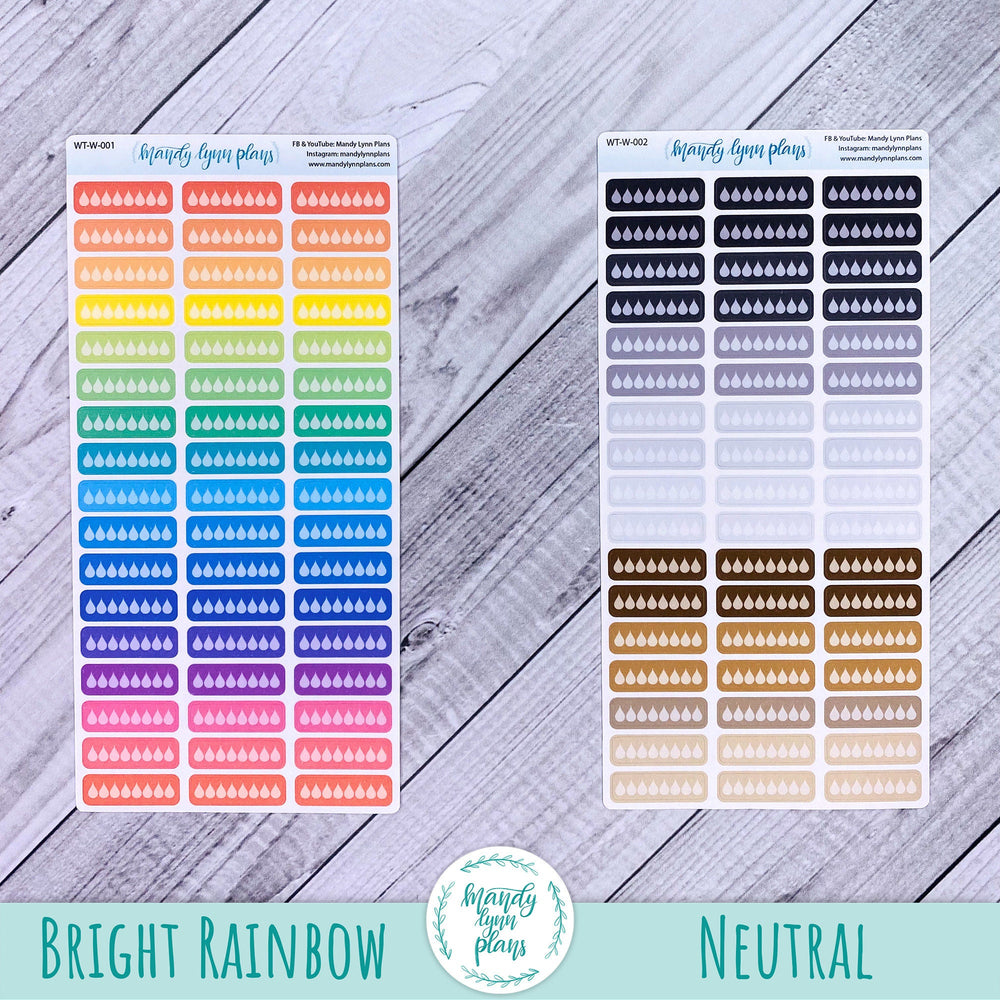 Each sheet contains 51 water trackers measuring .25" tall and almost 1 inch wide