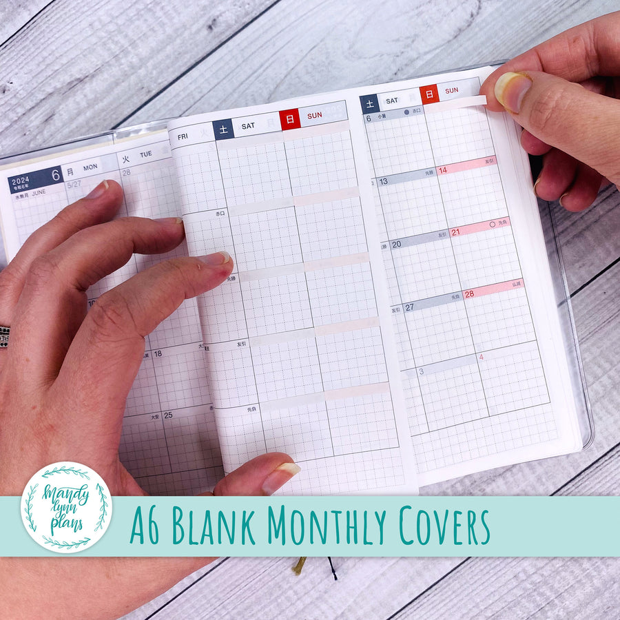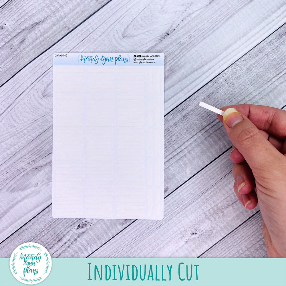 These column dividers are designed for use in the Hobonichi A6. They are specifically designed to cover up the printed red and gray boxes on the monthly section. These boxes are on the weekends and holidays. 76 strips are included on the sheet.