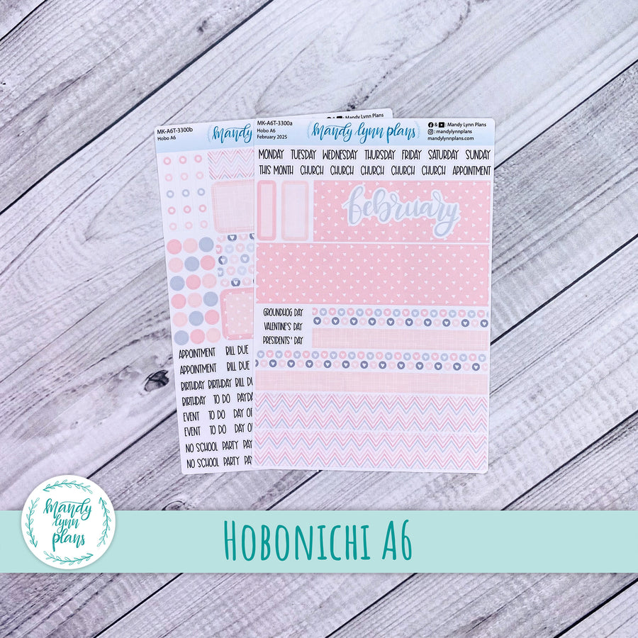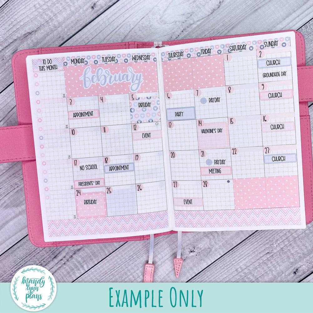 This kit includes 2 sheets that contain washi strips, functional items, and script stickers designed for the A6 monthly pages.