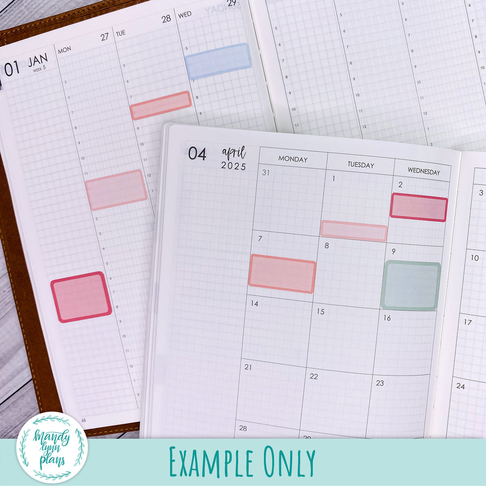 These labels are designed for use in the Plans by Just Scribble. They fit nicely in the one hour time slot if you are using the pre-printed timeline in the weekly view and also in the monthly spread.