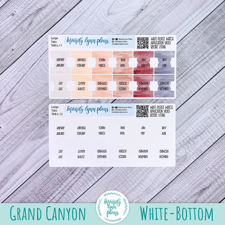 Large tabs have 12 on each sheet and small has 14. In the example pictures the large size tabs are on the A5 Hobonich Cousin and the Hobonichi Weeks. The small size is on the B6 and A6 planners. Of course you can use whichever size you prefer on any of your planners or journals. For reference, the large tabs are 0.55" wide and the small are 0.43" wide. Both large and small are 0.25" tall.