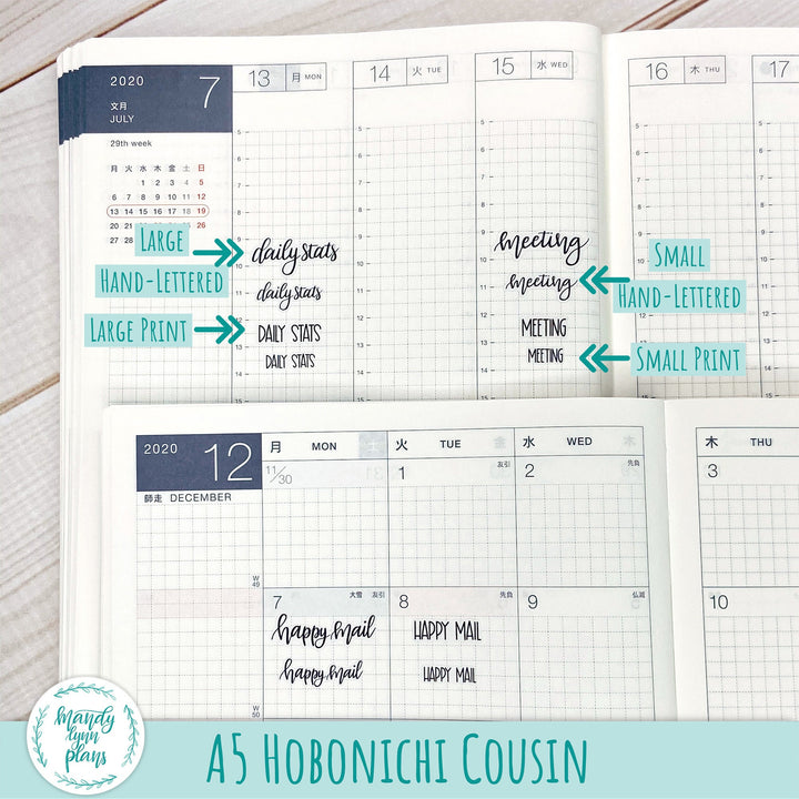 This listing is for one script sticker sheet designed for the Hobonichi Cousin, Weeks, or A6 but it could be used in any planner or bullet journal!
