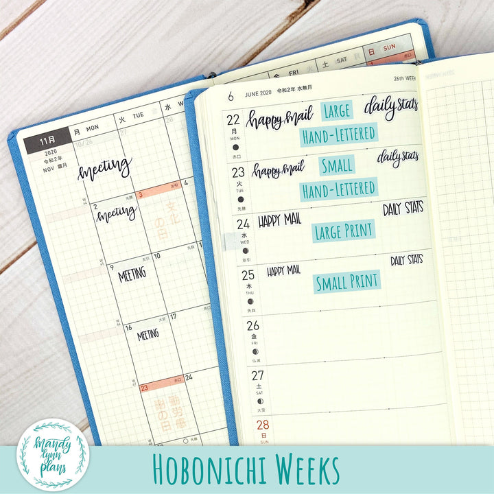 This listing is for one script sticker sheet designed for the Hobonichi Cousin, Weeks, or A6 but it could be used in any planner or bullet journal!