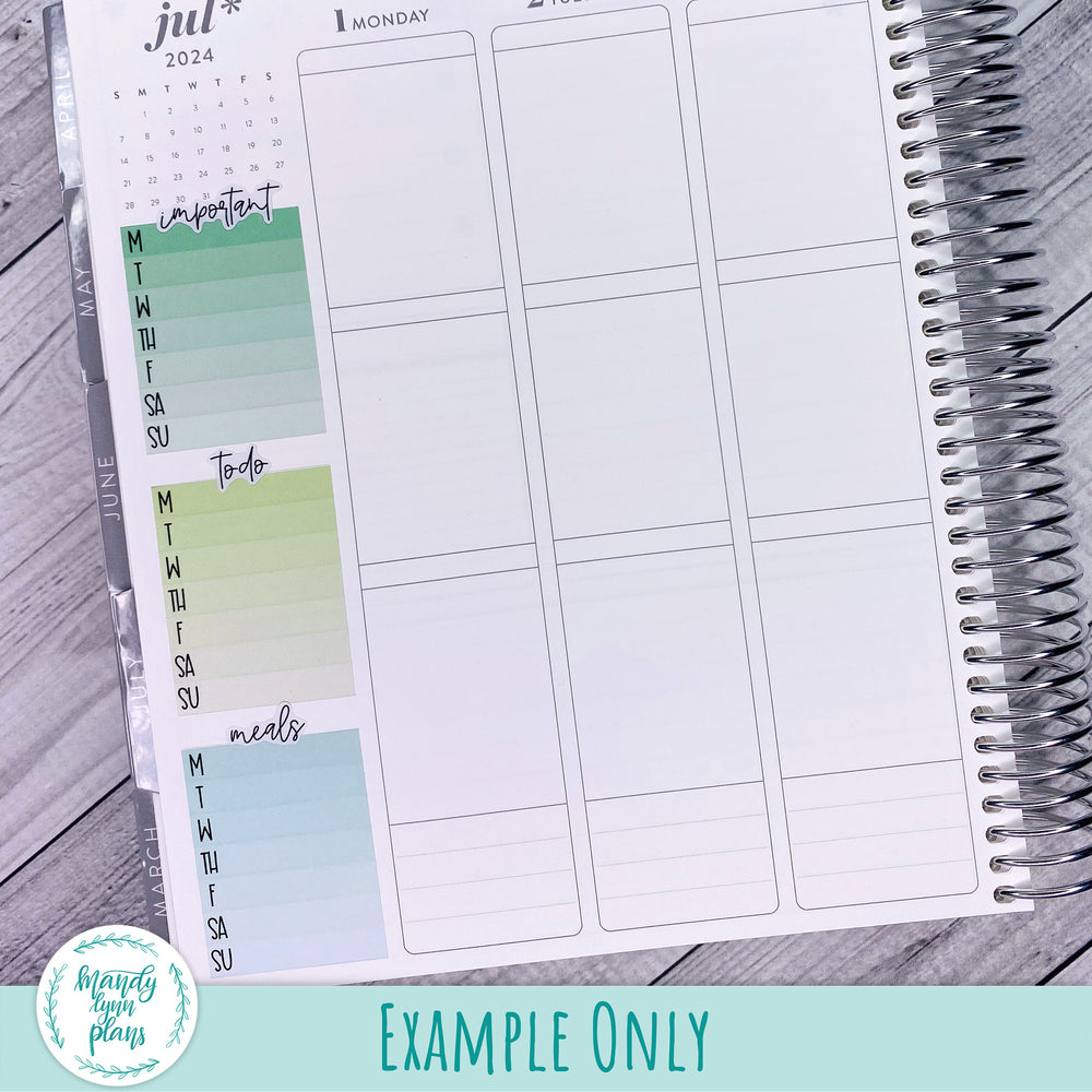 These weekly ombre boxes are designed for the sidebar in Standard Vertical planners, but can be used in any planner or bullet journal. They are 1.5 inches wide.