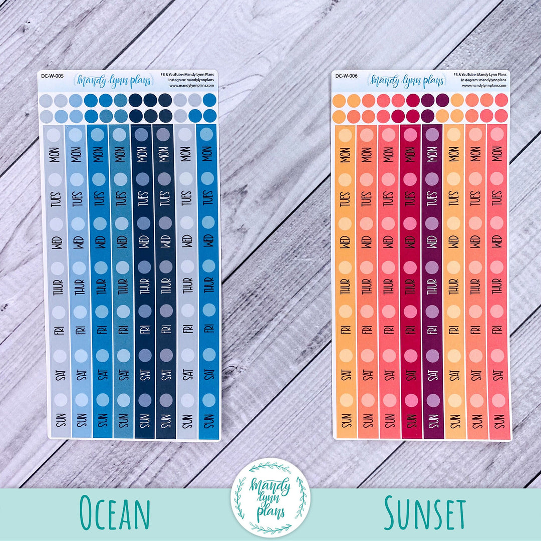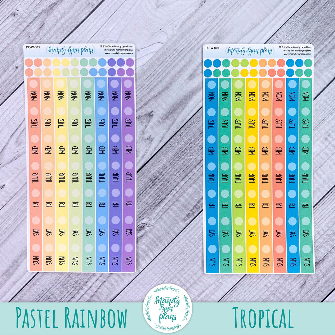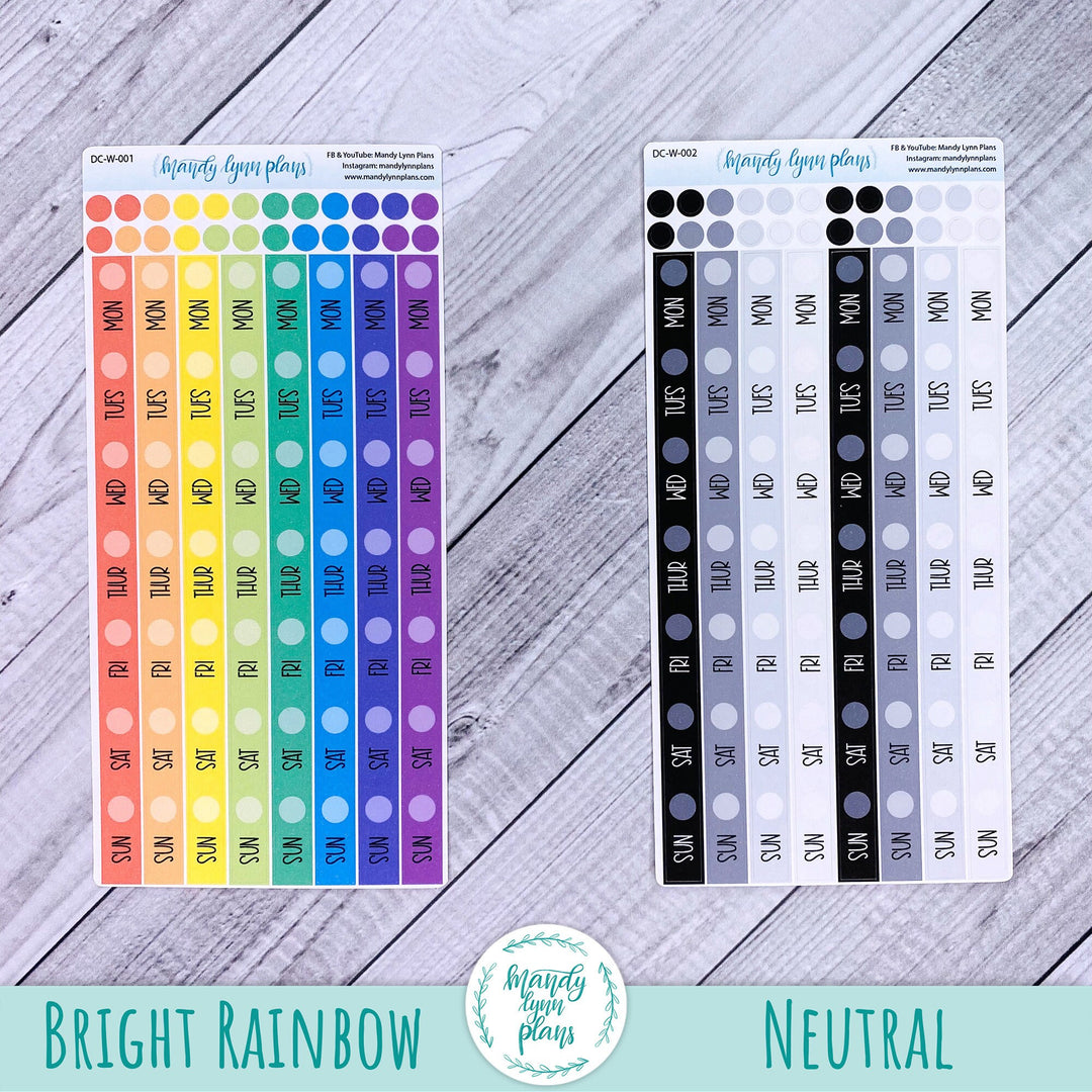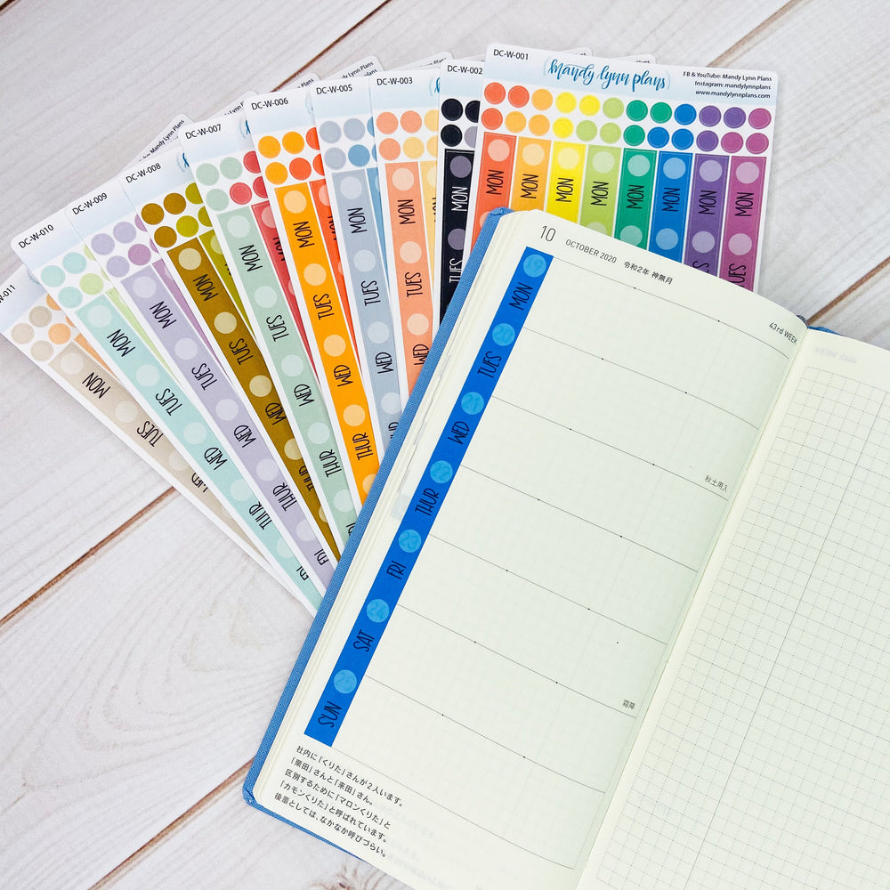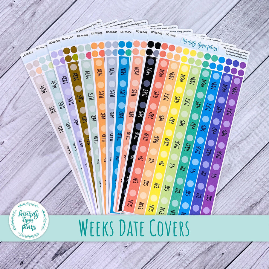 Each sheet contains 8 weekly date covers (measuring almost 6" tall and .25 inches wide) and 24 planner dots of matching colors.