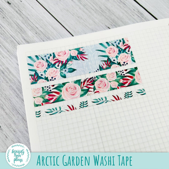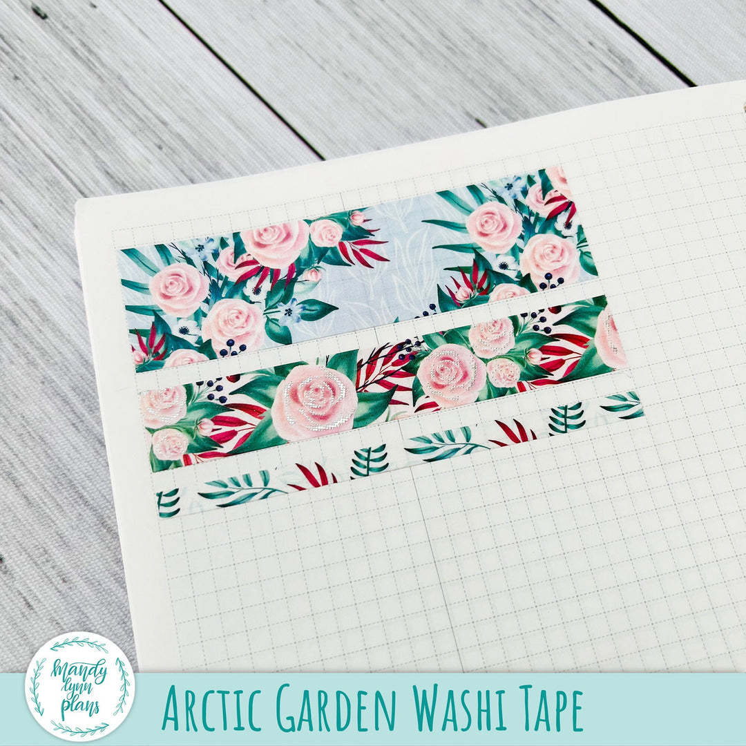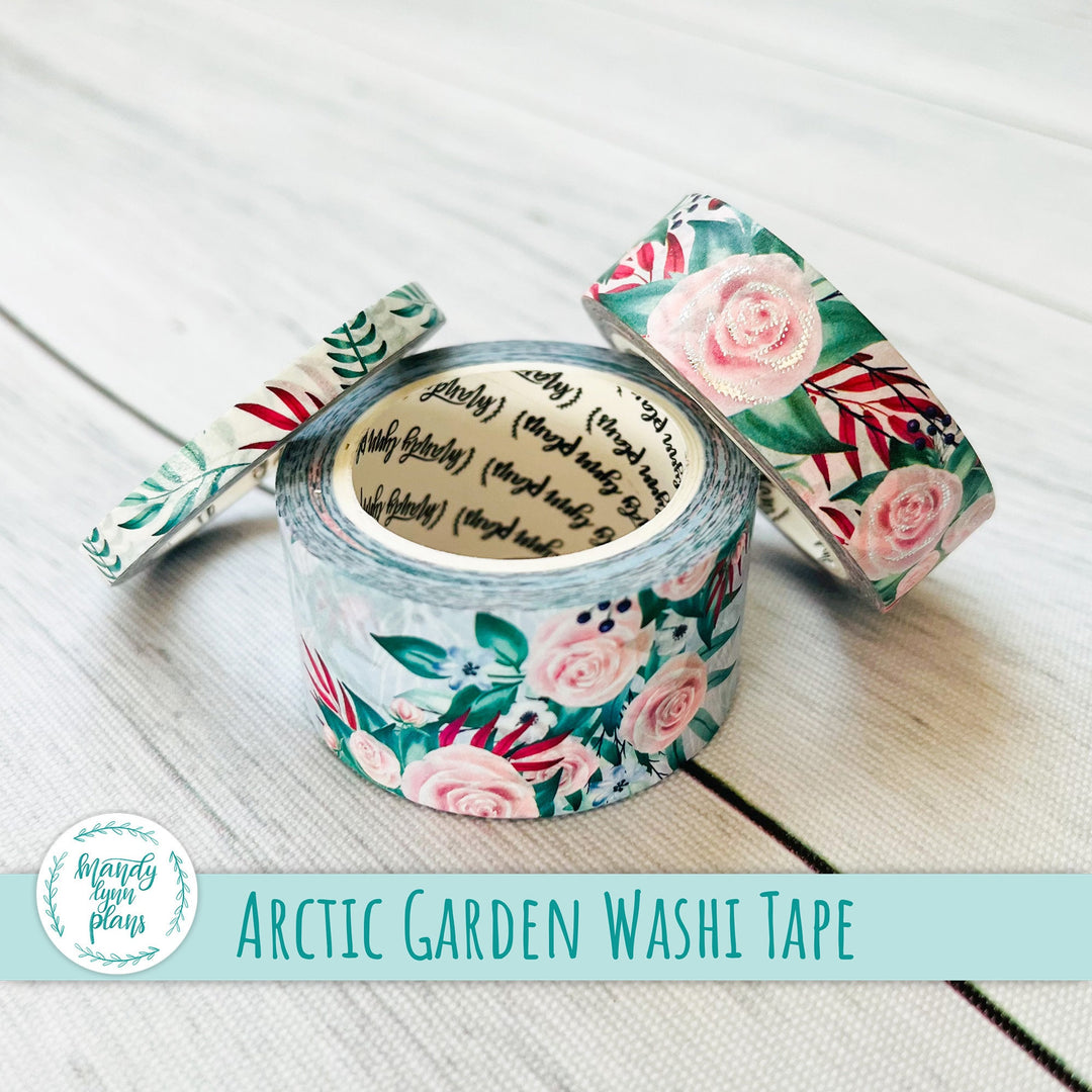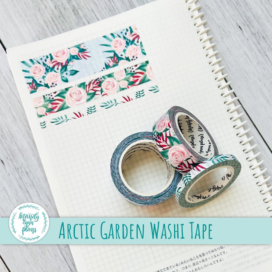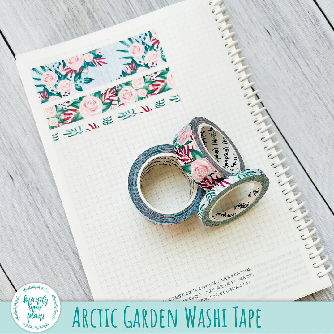 This listing is for a Set of THREE coordinating washi tape rolls that match the Arctic Garden kits and add-ons we have in the shop. The washi tape is 25mm, 15mm, and 5 mm x 10m. The medium sized washi tape has silver foiling.