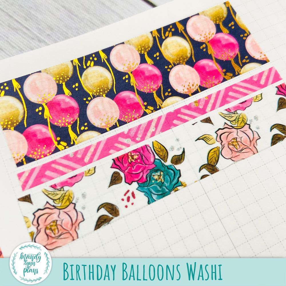 This listing is for a Set of THREE coordinating washi tape rolls that match the Birthday Balloons kits and add-ons we have in the shop. The washi tape is 25mm, 15mm, and 5 mm x 10m. The thickest washi tape has gold foiling.