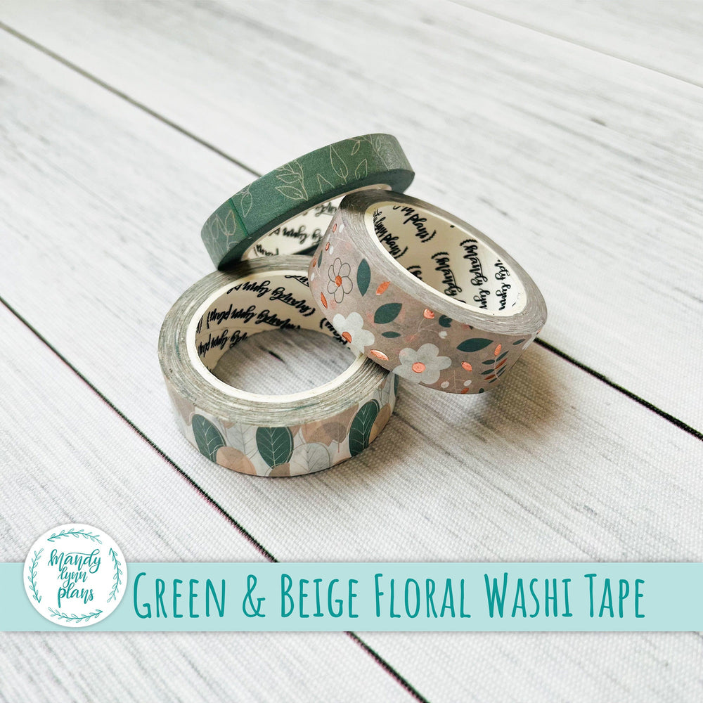 This listing is for a Set of THREE coordinating washi tape rolls that match the Green and Beige Floral kits and add-ons we have in the shop. The washi tape is 15 mm, 15 mm, and 8 mm x 10m. One washi tape has rose gold foiling.
