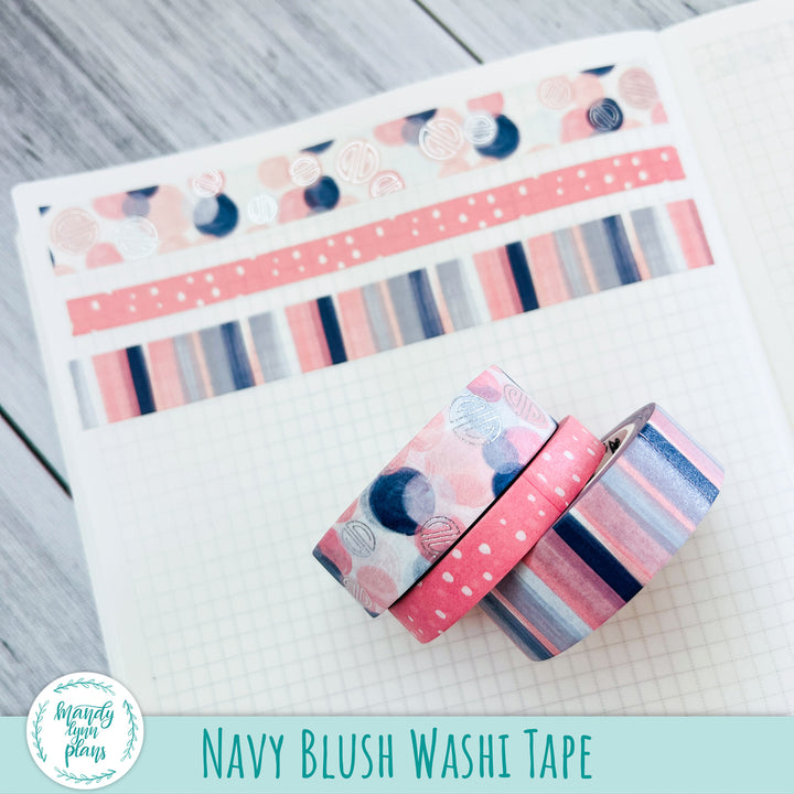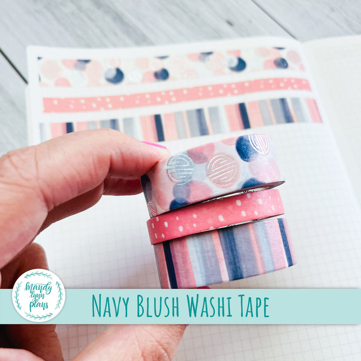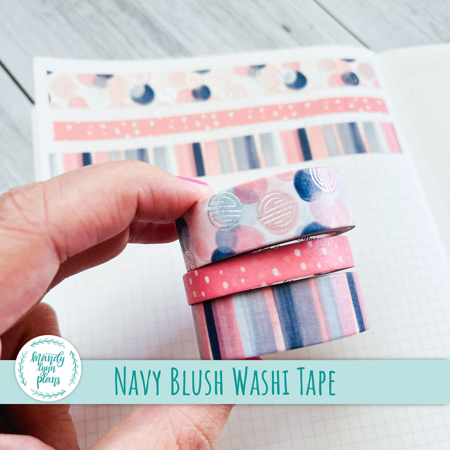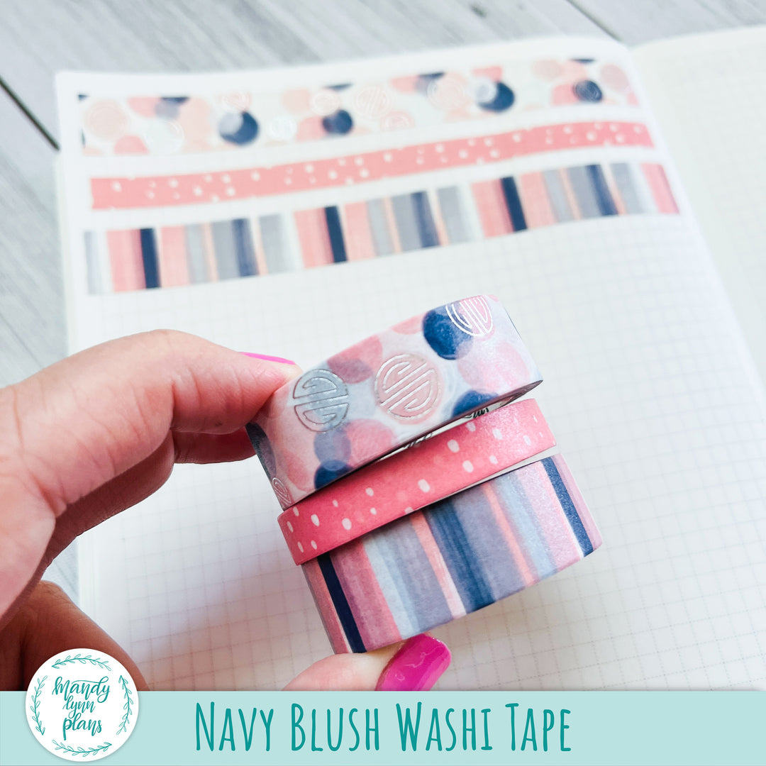 This listing is for a Set of THREE coordinating washi tape rolls that match the Navy Blush kits and add-ons we have in the shop. The washi tape is 15 mm, 15 mm, and 8 mm x 10m. One washi tape has silver foiling.