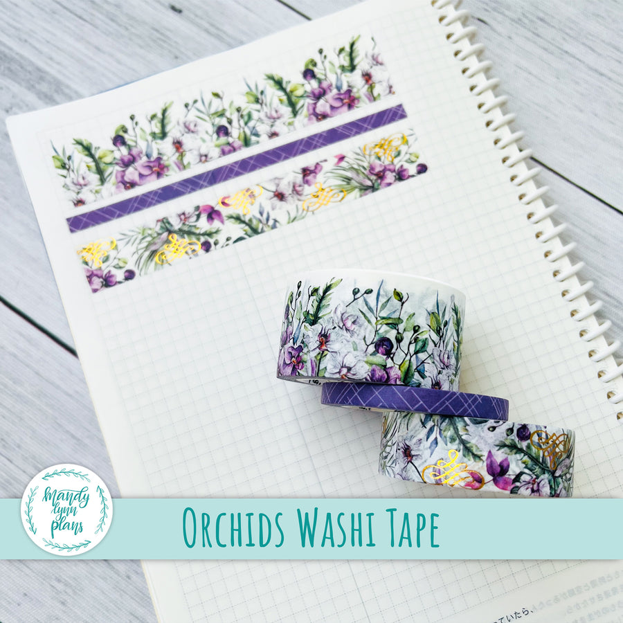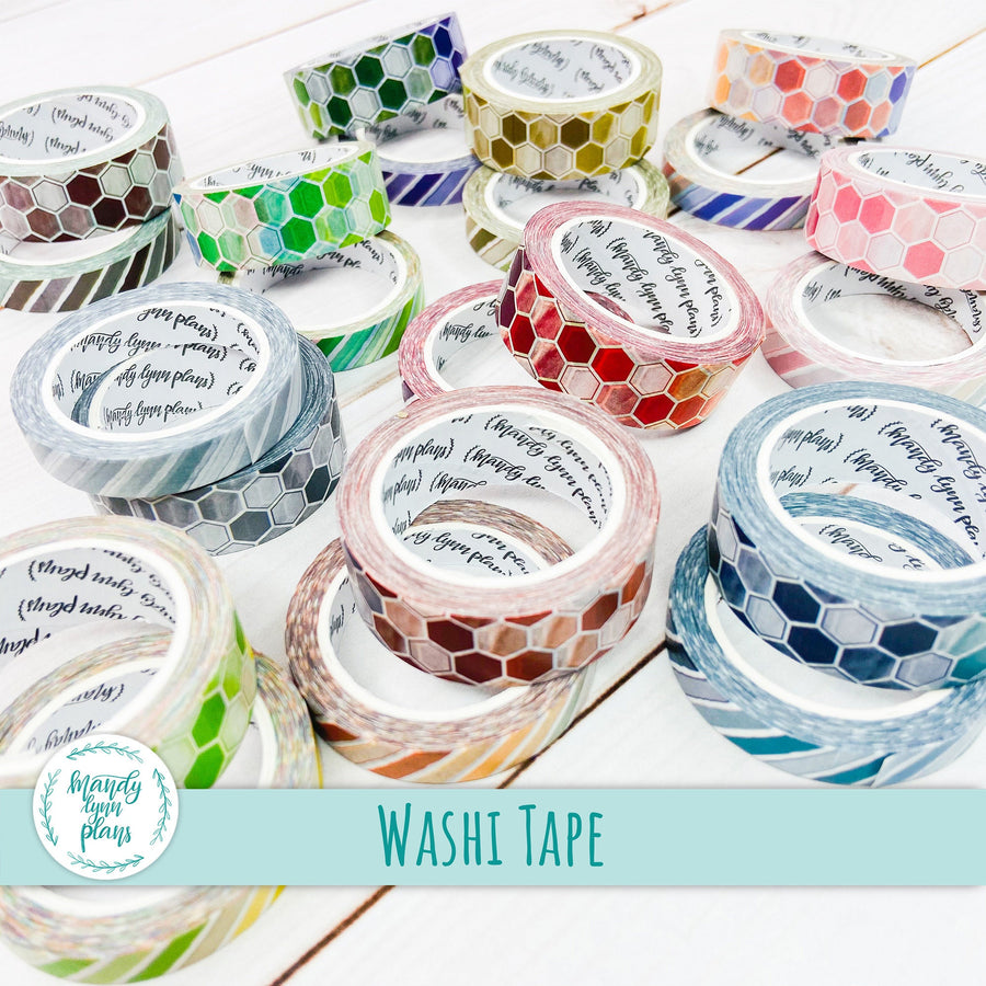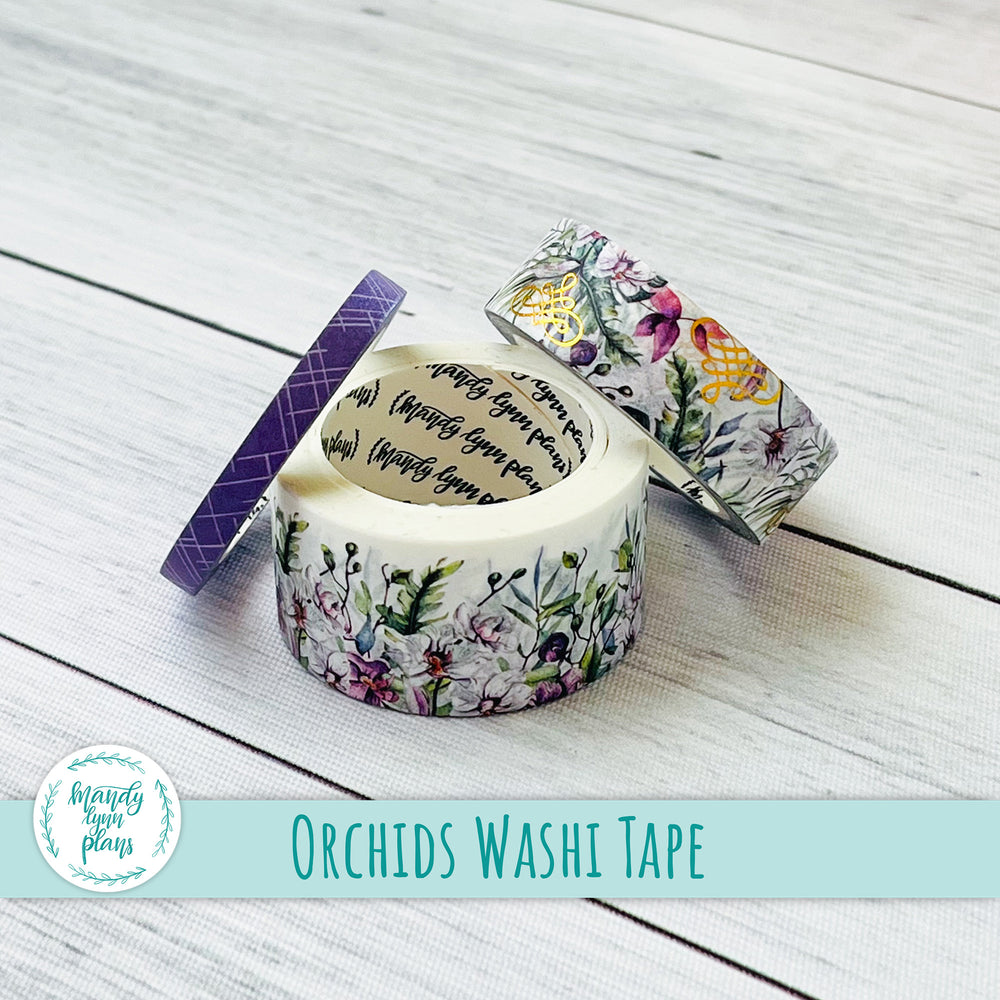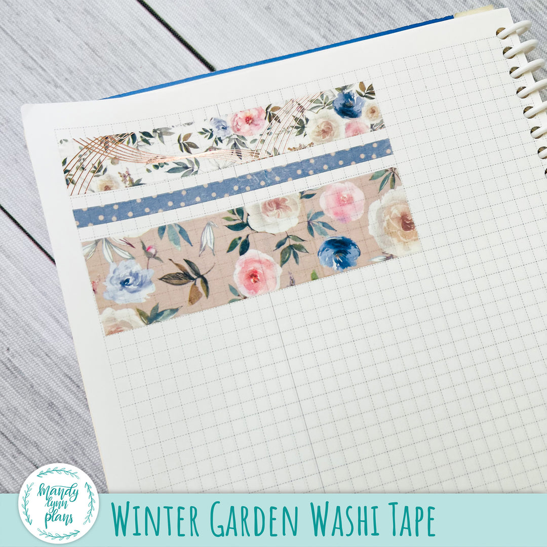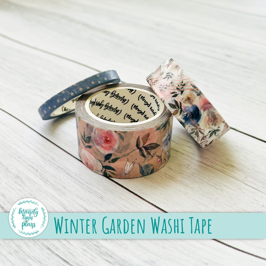 This listing is for a Set of THREE coordinating washi tape rolls that match the Winter Garden kits and add-ons we have in the shop. The washi tape is 25mm, 15mm, and 5 mm x 10m. The medium sized washi tape has rose gold foiling.