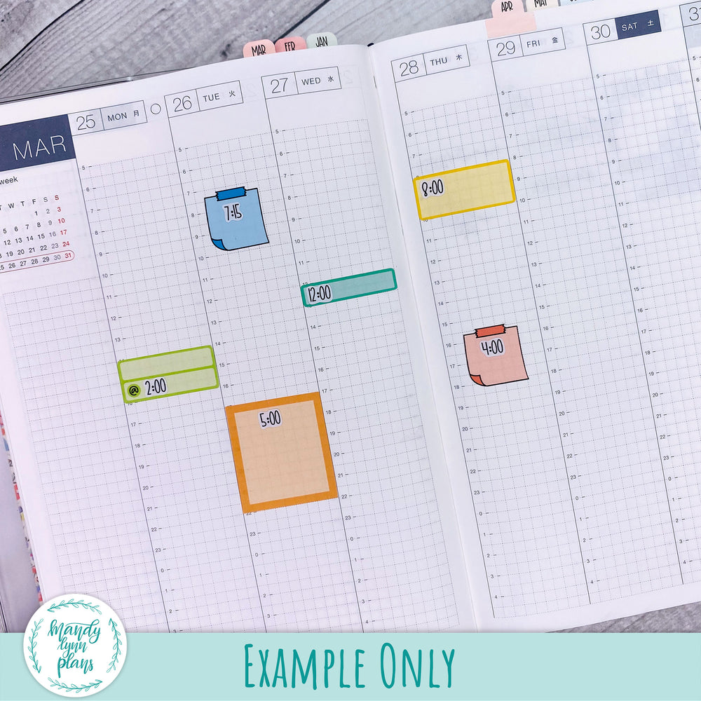Times are shown in 15-minute increments, and there are 4 of each time on this mixed sheet. Individual time sheets are also available if you need more than 4 of a specific time.
