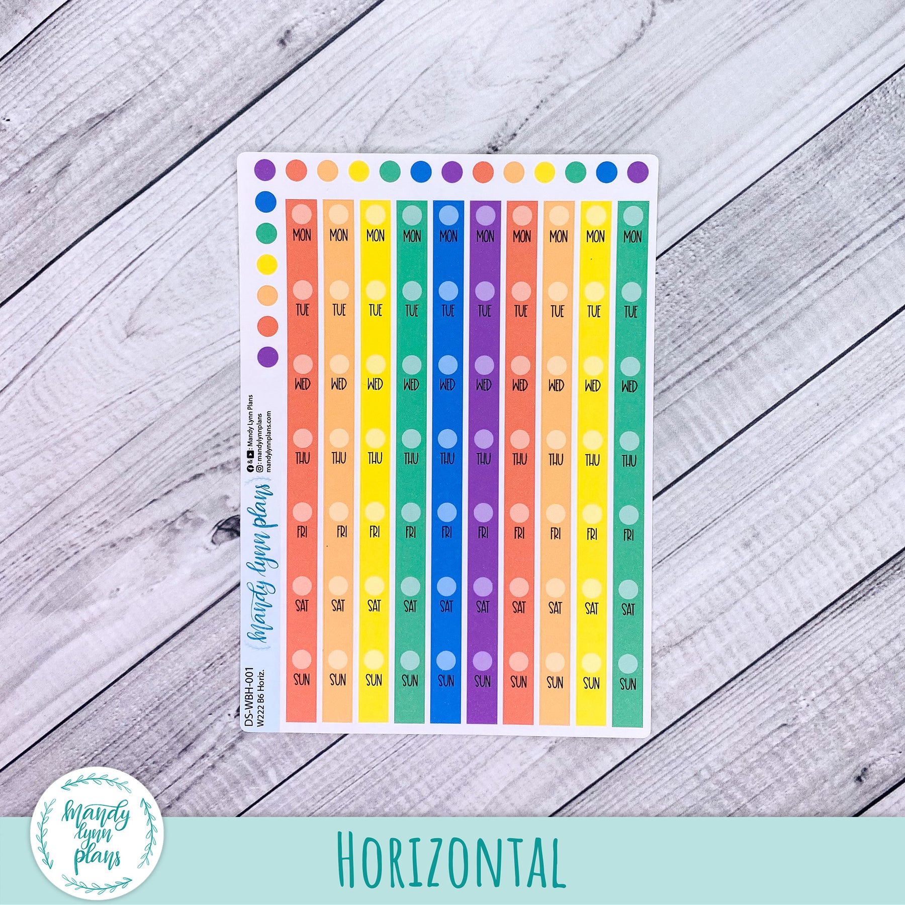Each sheet contains 5-10 sets of weekly date covers and functional planner items of matching colors. Stacked weekends have 5 sets & unstacked weekends have 6 sets per sheet.