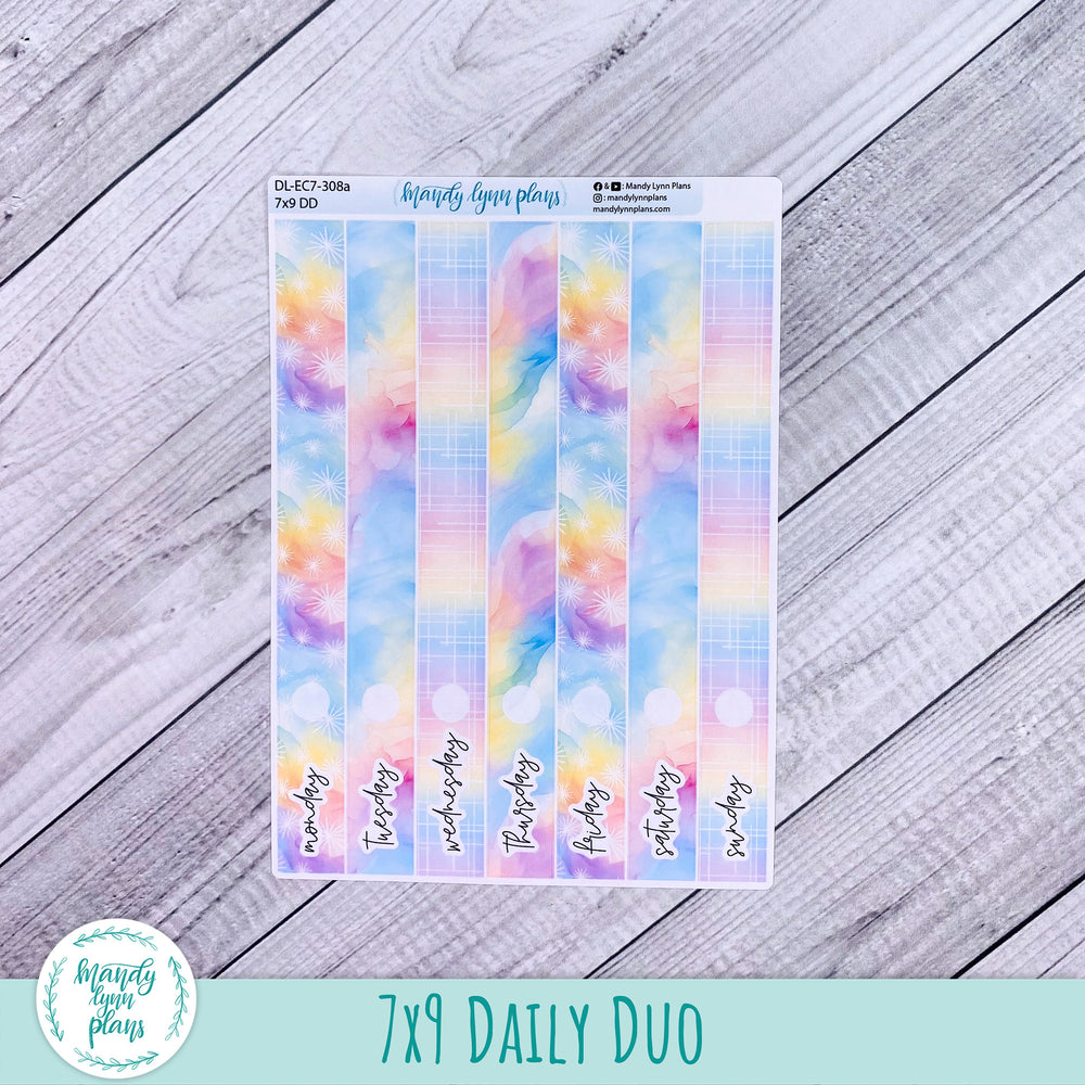 This kit includes 2 pages of stickers: 10 large washi strips and 10 skinny strips for the bottom of the page. It is designed for the 7x9 EC Daily Duo planner.