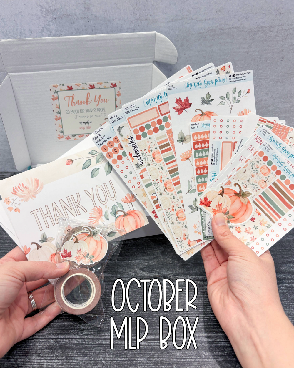 The MLP subscription box is for the adventurous planner who likes to receive a surprise-themed weekly kit (plus lots of add-ons!) for one week of the month. Please note the subscription box is NOT intended to provide a month worth of stickers. It includes only one weekly kit, and, if the daily or monthly is added, it only includes one of each. While many customers are able to get more than a week per box because of the ample add-ons and washi tape, this requires some flexibility in planning style. If you want to purchase a whole month of sticker kits, please check out our MEGA Subscription Box, which allows you to add weekly, daily, or journal kits to fit your needs.